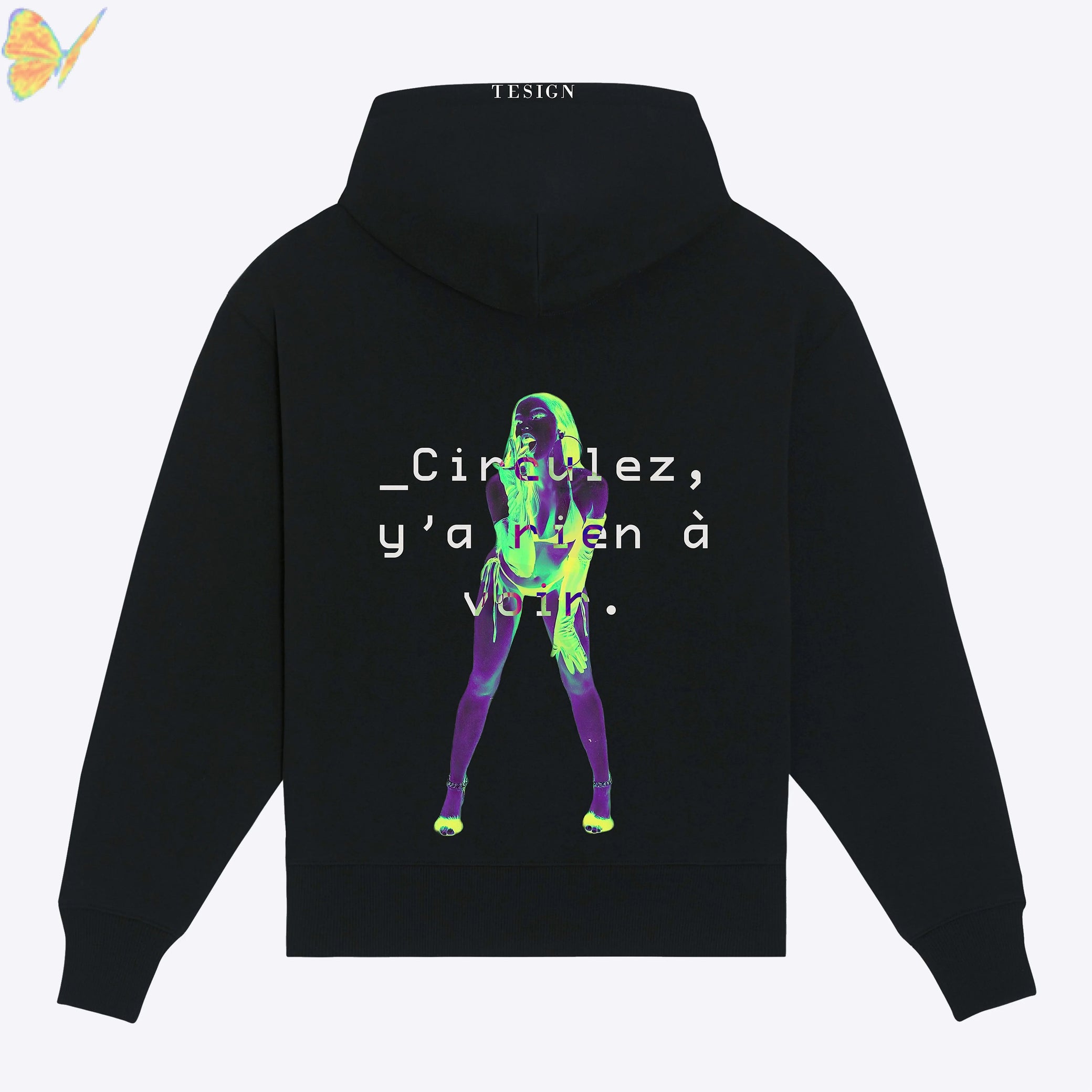 Notre hoodie met en avant notre slogan, animé par un graphisme en vision négative.